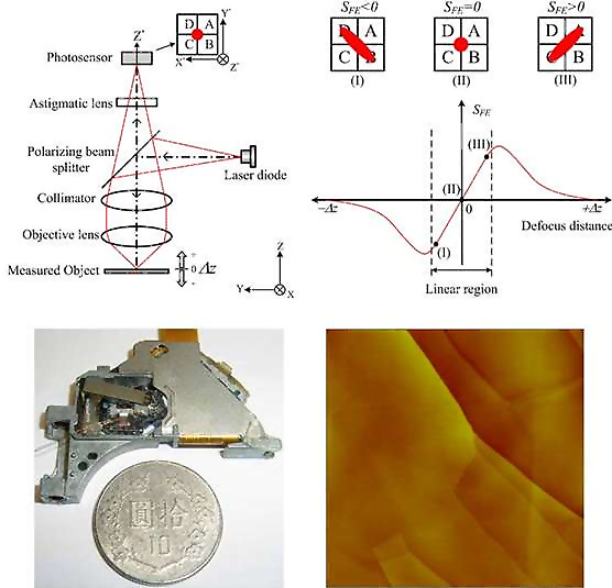 We have found that the astigmatic optical system inside the commercial DVD optical head can simultaneously detect the height and the two-dimensional tilt angle of a surface with a very high sensitivity and a very high speed. No other detection system has been demonstrated with such a capability. An atomic force microscope, using our detection system to sense the deflection of microfabriacted cantilevers, can resolve single atomic steps on graphite surfaces with the noise level less than 0.04 nm in the topographic images, equivalent to those of the commercial AFMs. This astigmatic detection system can even detect mechanical resonances due to thermal vibrations of microfabricated cantilevers. This DVD-based astigmatic measuring system is small and compact, and it has the potential to reach detection bandwidth over 100 MHz. This may lead to future development of high sensitivity and high-speed AFMs as well as high-sensitivity MEMS or NEMS-based chemical or biological sensors. The published works have also been covered by nanotechweb on March 13, 2008 as a major story. A National project aiming at further development of the astigmatic optical system is currently underway. Several proto-types of DVD-based AFMs have been developed successfully. (Appl. Phys. Lett. 91, 221908 (2007); Nanotechnology 19, 115501 (2008))