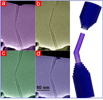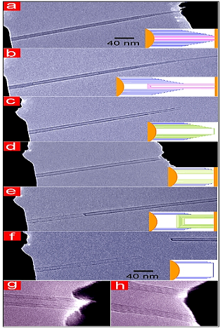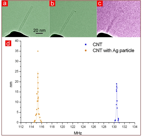 Figure 2 displays TEM images of a MWNT at different stages in successive inner peeling processes. When the gold knife edge was pulled away, the attached inner tubes were extracted from the MWNT. Figure 2b shows inner tubes pulled halfway out of the outer tubes. A clean area of the knife-edge was moved to the tip of the MWNT and the same process was repeated to pull out more inner layers, as shown in Figure 2d and e. A small Ag particle of about 3 nm in diameter was attached to its top end. The resonance frequency of the original tube was 130.5MHz, and was shifted to 115.3MHz after the attachment of the particle. By simple calculation using a previously described formula, the mass of the Ag particle was estimated to be 1.8*10-19 g, which is close to the mass of 1000 atoms, roughly a 3 nm Ag particle. Based on the shape of the curve in Figure 5d, it exhibited a very high Q factor (1000). The ultimate mass resolution is determined by this factor and, for the current tube, the mass sensitivity is about 10-22 g.