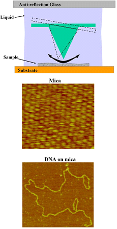 Current atomic force microscopy (AFM) modes mainly use the flexural deflection (static or dynamic) of the cantilever as the feedback input to maintain the tip-sample separation. However, it is relatively difficult to determine the contact point with the flexural modes because most long-range forces are acting in the normal direction. In contrast, the torsion resonance (TR) mode is affected by the lateral force gradient acting on the tip only, and the lateral forces starts to occur only when the tip is getting in contact with the sample surface. We have used the frequency shift of the torsion resonance as the feedback control. The frequency shift exhibits a sharp jump from zero upon contact and is a monotonic function of the tip-sample distance, similar to the behavior of the tunneling current in STM. We have demonstrated atomic resolution on a mica surface in water with a relatively blunt tip and the lateral force is negligibly small. Our imaging of DNA on mica surfaces in solution exhibits a height around 2 nm, very close to the diameter of DNA determined with X-ray diffraction. This indicates very small loading force applied by the tip. Thus this soft-contact TR mode is very suitable for imaging soft biological samples in liquid. In addition, our measurements indicate that even long and soft cantilevers can achieve a Q value of 50-70 with the TR mode in water. The Q factor and the resonant frequency of the first torsion resonance in water is about two orders of magnitude higher than those of the fundamental flexural resonance, and thus the TR mode may provide a higher force sensitivity than the dynamic flexural mode. The result has been published on Nanotechnology 21, 065710 (2010).