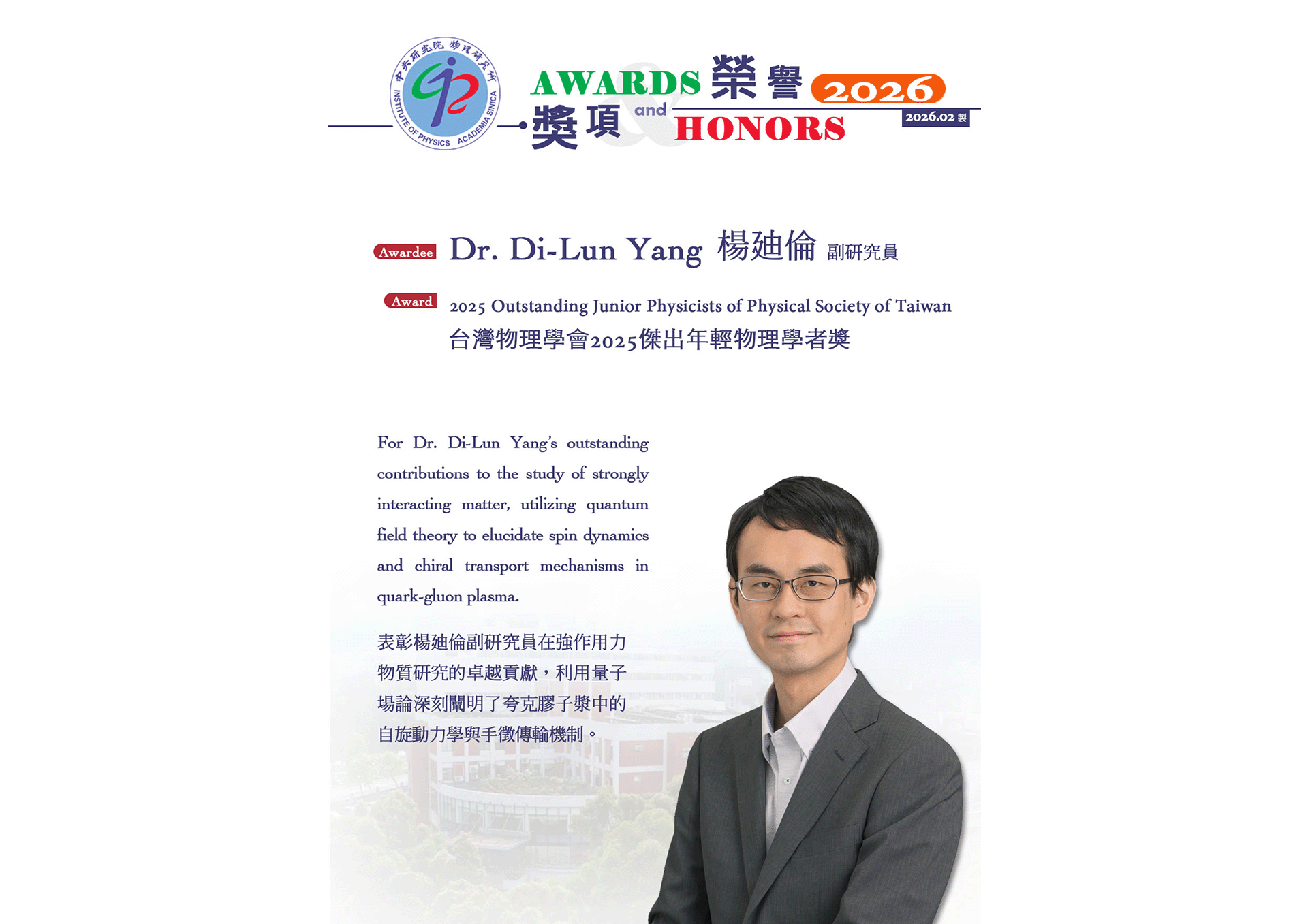 Associate Research Fellow Di-Lun Yang has been honored with the "2025 Outstanding Junior Physicists" by the Physical Society of Taiwan. This award recognizes hisoutstanding contributions to the study of strongly interacting matter, utilizing quantum field theory to elucidate spin dynamics and chiral transport mechanisms in quark-gluon plasma.
