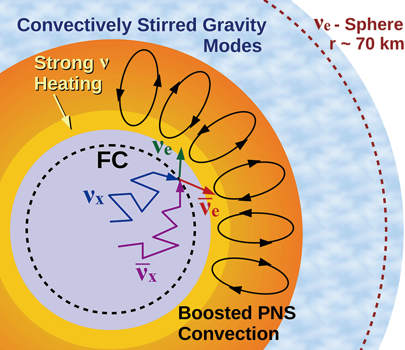 Figure 1: A schematic overview of enhanced convection inside the proto-neutron star (PNS) caused by neutrino (ν) flavor conversions (FC). The subscripts indicate different neutrino flavors.