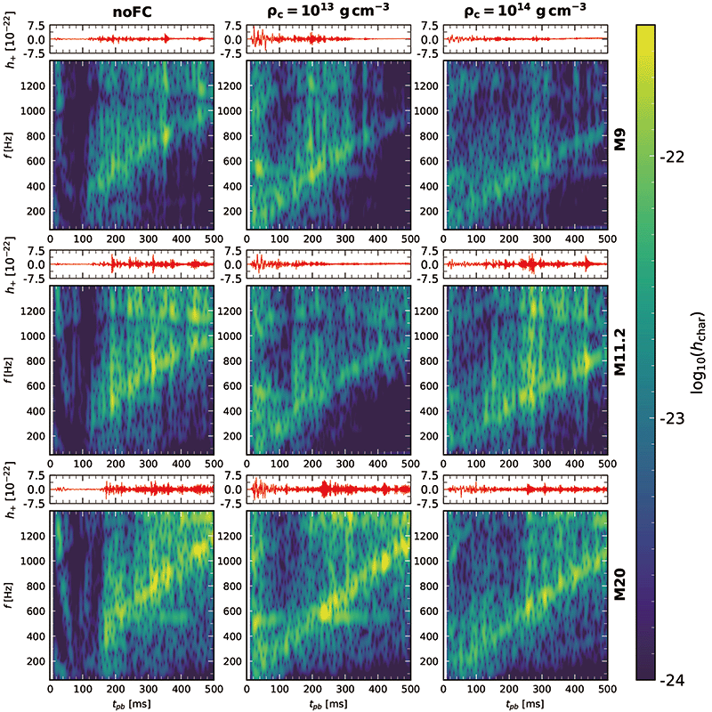 Figure 2: Amplitudes and spectrograms of the gravitational wave signal obtained from numerical simulations. The different rows correspond to stellar progenitors of varying masses. The left column shows simulations without neutrino flavor conversion, while the two right columns represent scenarios where flavor conversions occur at different locations inside the neutron star. The horizontal axis indicates time after core bounce, and in the spectrograms the vertical axis indicates frequency. In the left column, the vertical blue band signalizes the quiescent phase shortly after core-bounce, which is absent in the other models. The time of core-bounce can be independently determined from the measurement of neutrino emission.