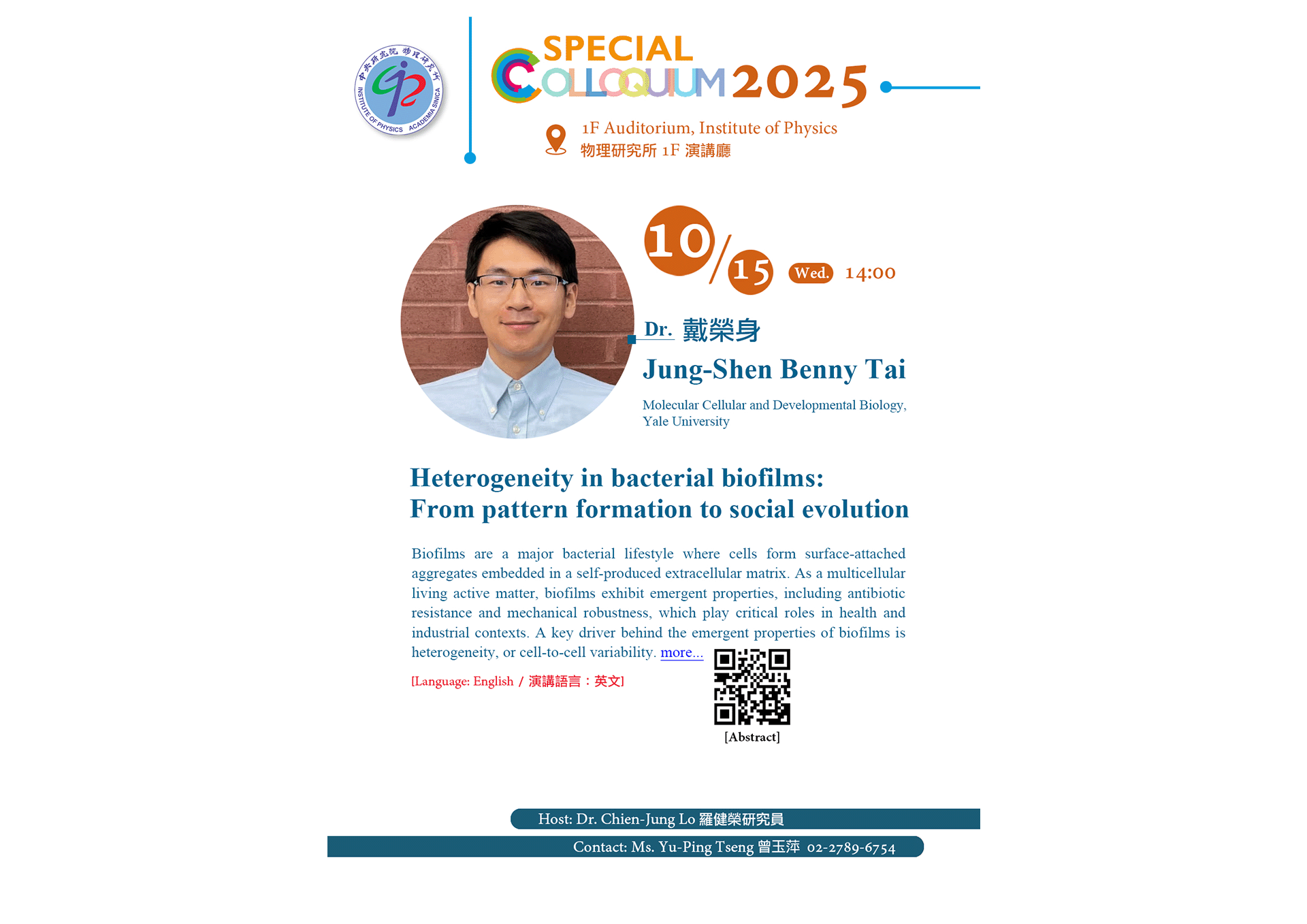 Biofilms are a major bacterial lifestyle where cells form surface-attached aggregates embedded in a self-produced extracellular matrix. As a multicellular living active matter, biofilms exhibit emergent properties, including antibiotic resistance and mechanical robustness, which play critical roles in health and industrial contexts. A key driver behind the emergent properties of biofilms is heterogeneity, or cell-to-cell variability. In the first part of the talk, I will present a newly developed imaging platform that reveals significant phenotypic heterogeneity and spatial patterning in clonal Vibrio cholerae biofilms. By integrating imaging, genetics, and modeling, we show that this sorted pattern is driven by matrix-mediated differential interactions between cells and their local environments. Importantly, our results show that this heterogeneity and emergent pattern formation enhance the fitness of biofilm-forming cells, expanding the classical picture of the biofilm life cycle. In the second part, I address a longstanding question in the evolution of social behaviors in biofilms: how diffusible matrix production remains stable against exploitation by non-producers. We demonstrate that shared matrix components function as public goods and are vulnerable to exploitation, and stability of matrix production depends critically on biofilm spatial structure, exploitation radius, and flow conditions. Together, these results provide new insights into biofilms by highlighting the role of heterogeneity at both the phenotypic and genotypic levels.