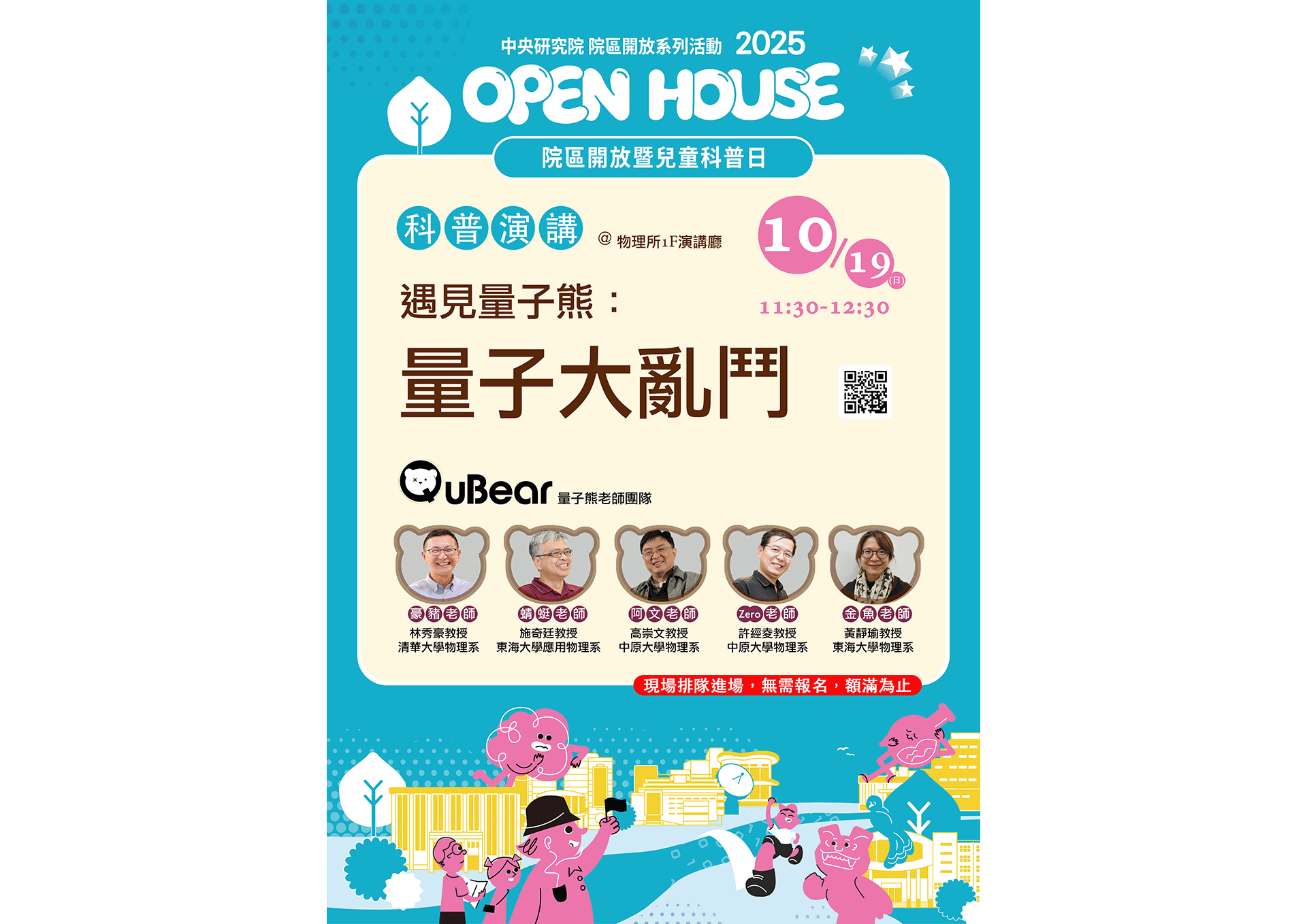 2025/10/19(Sun) 11:30 -12:30 一樓演講廳 1F, Auditorium Title 遇見量子熊:量子大亂鬥 Speaker 量子熊老師團隊 () QuBear Team () URL https://openhouse.sinica.edu.tw/events/263 Poster Language 演講語言 (Language): in Mandarin Hosted by 張元翰 特聘研究員兼所長 Chang, Yuan-Hann / Distinguished Research Fellow & Director