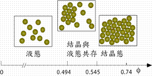Perrinªº¹êÅçµ²ªG»P®ðÅé¤À¤l¦b«¤O¤Uªº¤À§G¬Û¦P¡AÅã¥Ü½¦Åé²É¤lÁöµM¬O¤ñì¤l©Î¤À¤l¤j«Ü¦hªº²É¤l¡A¦ý¬O¥¦Ì«Ü¦h¬ÛºA¬O¬Û¦üªº¡Cª«²z¾Ç®a±N½¦Åé²É¤l·í°µ¡§¤j«¬ì¤l¡¨¨Ó¬ã¨sµ²´¹¹Lµ{(crystallization)©ÎªÌ¬Á¼þ¬Û(glass)¡A¦]¬°¦³§ó¦h¥i¥Îªº¹êÅç»ö¾¹¨Ó´ú¶q½¦Åé²É¤l©Ò¹ïÀ³ªÅ¶¡¤Ø«×(~1 mm)»P®É¶¡¤Ø«×(~1 msec-1 sec)¡A¦Ó¦bì¤lªº¤Ø«×«h§xÃø¦h¤F¡C½¦Åé²É¤l¬OÓ²z·Qªº¼Ò«¬¨t²Î(model system)¨Ó¸Ñµª«Ü¦h²Îpª«²zªº°ÝÃD¡C¨Ò¦p¦b²z½×²Îp¤O¾Ç¤W±`°Q½×ªº¨t²Î¬Oµw²y¼Ò«¬(Hard Sphere)¡A·í¨âÓ²yª¬²É¤l²y¤ß¤§¶¡¶ZÂ÷µ¥©ó¥b®|©M®É¡A¤§¶¡§@¥Î¤O¬°µL¤j¡A¦Ó¤j©ó³o¶ZÂ÷®É¡A¨S¦³¥ô¦ó§@¥Î¤O¡C¦b¦ÛµM¥@¬Éùتº½T«ÜÃø§ä¨ì³o¼Ëªº¨t²Î¡Aì¤l¤§¶¡¦³¦UºØ§@¥Î¤O¦s¦b¡C¦ý¦b½¦Åé²É¤l¨t²Î¡A¬ì¾Ç®a¥i¥H°µ¥Xªñ¦üµw²yªº¨t²Î¡CÃö©óµw²y¨t²Î¡A¦b¤»¹s¦~¥N¥½Hoover©MRee¥Ñ²z½×pºâ»P¼ÒÀÀ¹w´ú·íÅé¿n¤À¶q¼W¥[¡Aµw²y±N·|±q¤£³W«h±Æ¦Cªº²GÅ骬ºAÅܦ¨³W«h±Æ¦C¦¨µ²´¹ªº©TÅé(solid)¡A³oÓµ²á¬ÛÅÜ(freezing)µo¥Í¦bÅé¿n¤À¶q(volume fraction) f=0.494¡A·»¤Æ(melting)µo¥Í¦bf=0.545¡C¦ý²É¤l¤§¶¡¨S¦³§l¤Þ¤O¡AÅX¨Ïµ²´¹ªº¤O¹ê»Ú¤W¬Oæi(entropy) [2]¡C³oÓ²{¶H©èIJ¤@¯ë·§©À¡Aæi¶V¤j¨t²Î¶V¡§¶Ã¡¨¡A¦b¦¹§Ú̽T¬Ý¨ìæi¶V¤j¡A¦³§Ç(ordered)ªºª¬ºAªº¥X²{¡C³o¦b·í®É¤]¬O¤@Óª§Ä³ªº¹w´ú¡C¤@ª½¨ì¤K¹s¦~¥N¡APusey©Mvan Megen¦b½¦Åé²y¨t²Î¦¨¥\¦aÅçÃÒ§Y©l²É¤l¤§¶¡¨S¦³§l¤Þ¤O¡A¤]¯à±q²GºAÅܦ¨©TºA[3]¡Cn¤F¸Ñ³oÓ²{¶H¡A¥ý±q¤F¸ÑæiSªº©w¸q¡G