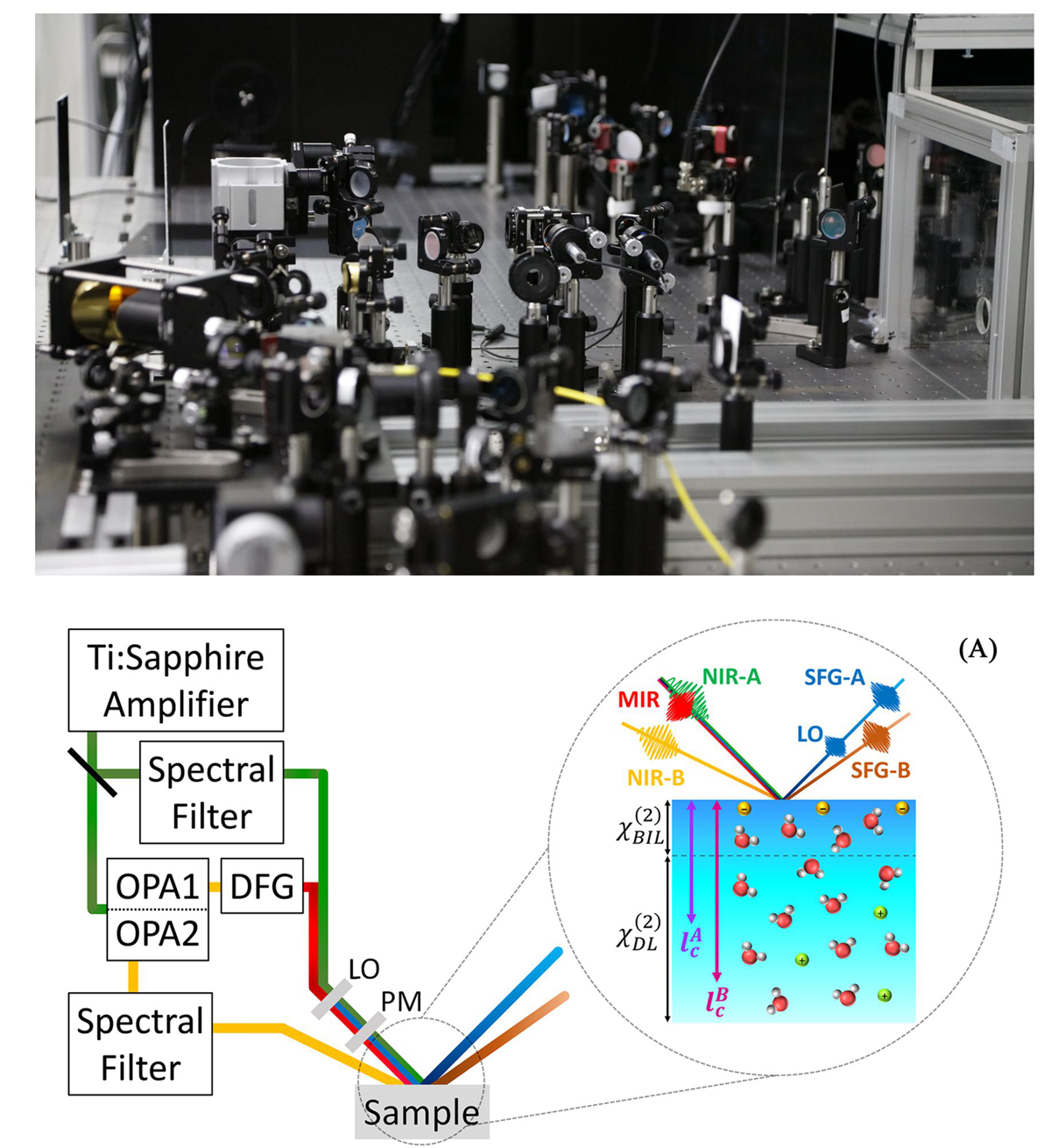 Vibrational SFG signals from a liquid interface are typically 1-10 photons per laser shot. To measure phase of such weak radiations from a vibrating liquid surface, we develop a PS-SFG spectroscopy with the common-path scheme. The light source is a 1-kHz, 50-fs Ti:sapphire laser, combined with an optical parametric amplifier (OPA) and a difference frequency generator (DFG). The generated mid-IR and near-IR beams (bandwidths of ~400 and ~15 cm-1, respectively) propagate collinearly through a reference quartz crystal acting as a local oscillator and a dispersive medium for phase modulation, and finally impinge on the sample. The SF signal generated from the sample in reflection interferes with the reference SF signal also reflected from the sample and creates an SF spectral interferogram that provides amplitude and phase information of the complex χ(2). A polychromator with a charge-coupled device is used for multiplex detection of a broadband spectrum. This system allows phase measurements with precision and reproducibility better than 3 degrees, and sensitivity of the amplitude measurement better than10-22 m2V-1。To further separate the surface second-order and bulk third-order contributions, we developed a momentum-dependent SFG scheme where multiple SFG spectra are measured with different phase mismatches. See Science Advances 9, eadg2823 (2023) for details.